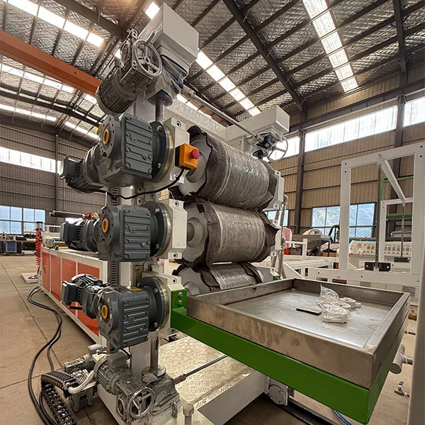 Lo stampo per lamiera TPU utilizza una testa a T-die cromata a specchio. Il design del percorso di flusso è simmetrico e liscio, senza macchie morte, garantendo la distribuzione uniforme del fuso. Il divario per le labbra da dado è sottratto (con una precisione di 0,01 mm), che accomodano gli spessori del foglio da 0,1 a 5 mm. La macchina per estrusder della foglio TPU è dotata di un'unità di raffreddamento e modellatura a tre roller. La superficie del rullo è polimerizzata e la temperatura dell'acqua di raffreddamento è controllata da un sistema di temperatura costante. Ciò consente un raffreddamento e una modellatura rapidi garantendo una superficie liscia e priva di graffi. La tolleranza di planarità e spessore del foglio (entro ± 0,03 mm) sono controllate dalla pressione tra i rulli.